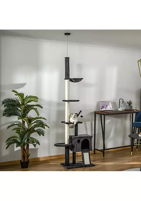 – The floor-to-ceiling cat tree ranges in height from 93.75″-106.25″; – It can be secured to the ceiling using the tension rod; – The multi-activity platform includes scratching posts, a scratching board, a hammock, perches, and cat toys; – Scratching posts wrapped with natural sisal rope to sharpen your cat’s claws and protect your furniture; – Includes a soft plush cover on the board, hammock and cat box to provide a warm and cozy area; – Particleboard construction keeps the whole cat tree stable and secure; – Suitable for cats within 10 lbs; – Assembly required;