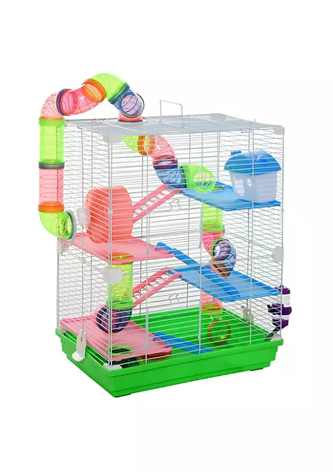 – Water bottle, food dishes, exercise wheel, small house and play tube included