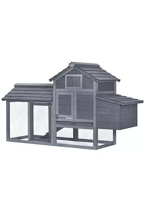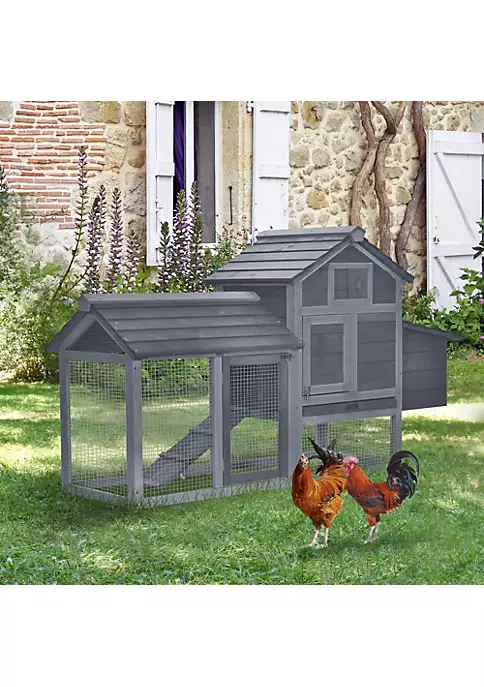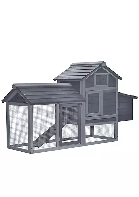 – Material: Fir; – Color: Grey; – Overall Dimensions: 59.25″ L x 21.25″ W x 34.25″ H; – House Dimensions: 19.75″ L x 18″ W x 25.25″ H; – Nesting Box Dimensions: 18″ L x 9.75″ W x 12.75″ H; – Run Dimensions: 19.75″ L x 18″ W x 8.25″ H (under house), 26″ L x 18″ W x 25.75″ H (side); – Window Size: 6.25″ L x 4″ H; – Door Size: 8.5″ W x 10.5″ H (house), 10.75″ W x 16.25″ H (run), 7.75″ W x 9″ H (inside door); – Slide-Out Tray Size: 17.25″ L x 17″ W; – Ramp Size: 17.75″ L x 6.75″ W;