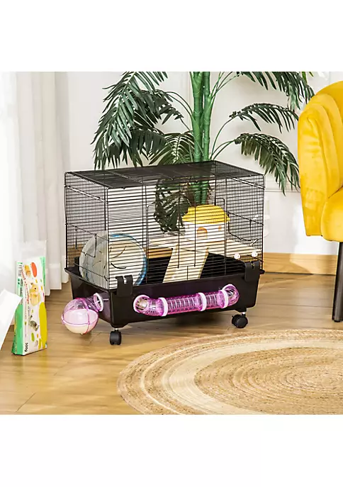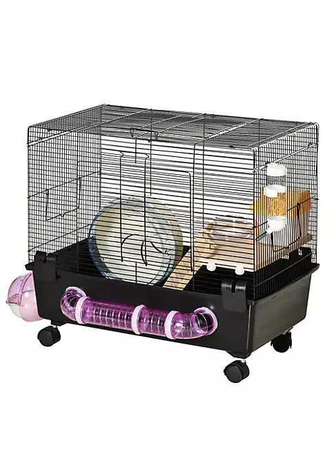 – Hut, water bottle, food dish, ladders, and exercise wheels included;