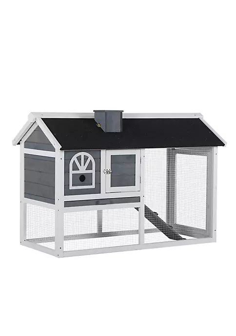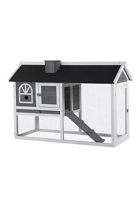 – Color: Grey, White; – Material: Fir, Metal Wire, Asphalt; – Overall Dimensions: 47.25″ L x 23.5″ W x 31″ H; – House Dimensions: 20.5″ L x 18″ W x 19″ H; – Door Size: 9.25″ L x 9.75″ H (Main House), 15.75″ L x 20.75″ H; (run area); – Hole Size: ฮฆ1.5″; – Run Box size (under the main house): 20″L x 18″ W x 11″ H; – Run Box size (side): 20.75″ L x 18″ W x 30.25″ H; – Ramp Size: 17.75″ L x 7″ W; – Chimney Size: 4.75″ L x 4.75″ W x 5″ H; – Tray Size: 19″ L x 19.75″ W; – Item Label: D51-174GY