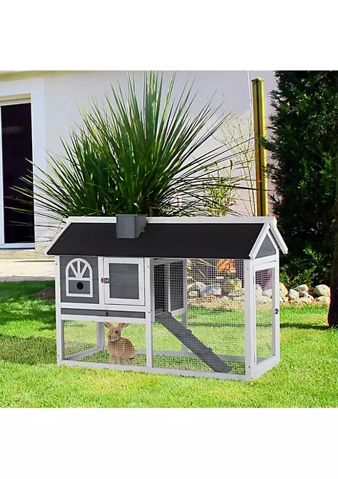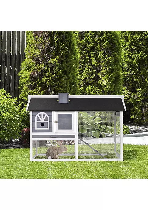 – The rabbit hutch is suitable for rabbits, bunnies, guinea pigs, chinchilla, and other small animals; – Includes an upper living space and large running area in the lower level; – Decorative window and simulated chimney compliment your backyard dรฉcor; – Lockable mesh door for your pet to enter and exit the bunny cage easily; – Solid fir wood frame and asphalt roof make this bunny hutch suitable for outdoor use; – Spacious running area connected to the living area with a ramp; – A hole and door on the rabbit cage allow you keep an eye on your pet; – Removable slide-out tray for easy and quick cleaning; – NOTE: Suitable for 2-4 rabbits. Buyer to determine the amount of pets that will fit in the hutch depending on breed and size